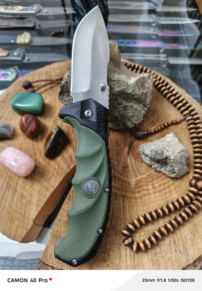 Koyu haki renkte ergonomik saplı, keskin paslanmaz çelik bıçağa sahip katlanır bıçak. Dayanıklı ve hassas kesim sağlar.