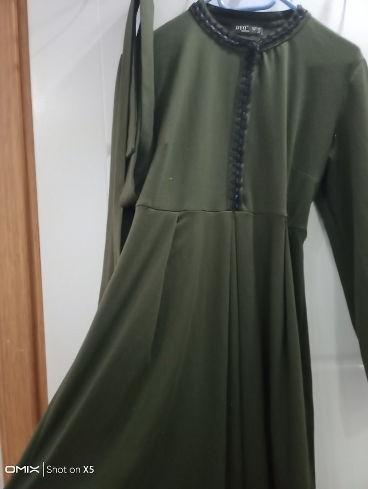 Koyu haki renkte, yüksek yakalı ve uzun kollu, kemerli bel kısmı ile bol kesim uzun elbise. Sentetik kumaştan, sade ve gotik tarzda, ofis için uygun.