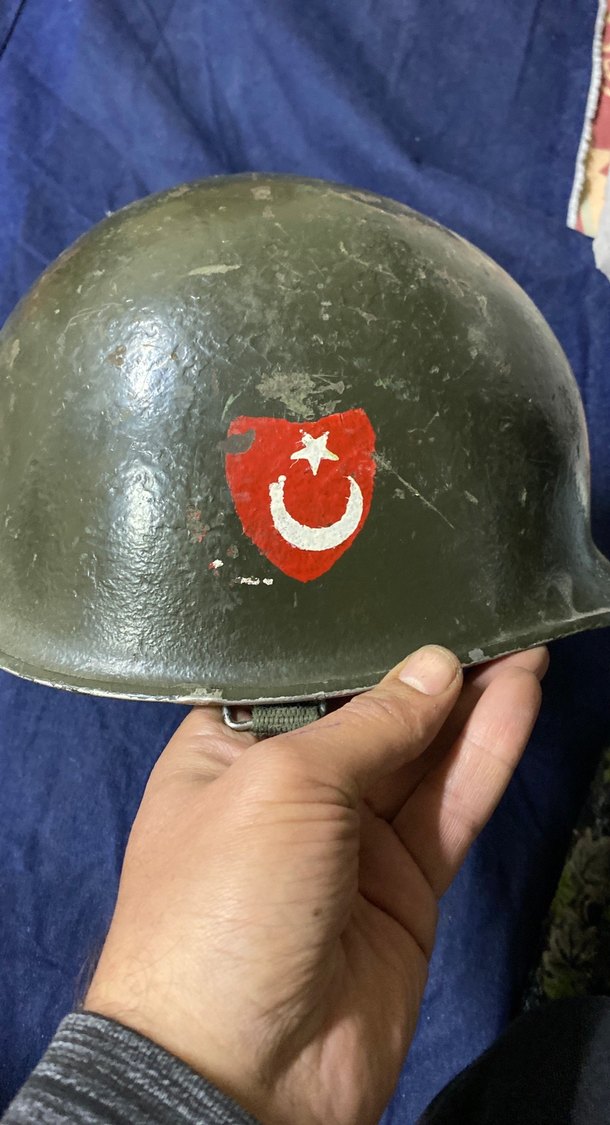 Model: Amerikan M1 miğferinin Türk Ordusu için üretilmiş veya uyarlanmış bir versiyonudur. Askeri literatürde genellikle "M1 Reissue" veya "Euro-clone M1" olarak da geçer. Türkiye, bu miğferleri hem ABD'den hibe almış hem de Almanya (VDN) gibi ülkelerden temin etmiş veya yerli olarak üretmiştir. • Dönem: Büyük ihtimalle 1970 - 1990 arası (Soğuk Savaş dönemi). Bu tip miğferler Kıbrıs Barış Harekatı döneminden 2000'lerin başına kadar aktif olarak kullanıldı. Ürün Hakkında: Türk Silahlı Kuvvetleri envanterinden çıkma, dönem (Vintage) M1 tipi çelik miğfer. Koleksiyoncular, dekorasyon amaçlı arayanlar veya askeri tarih meraklıları için nadir bir Durum: Kullanılmış, yaşanmışlık izleri mevcuttur (Battle worn). Orijinal yapısı korunmuştur.Detay: Miğferin ön kısmında el boyaması/şablon ile yapılmış Türk Bayrağı (Ay-Yıldız) arması bulunmaktadır. Bu detay genellikle tören veya nöbet miğferlerinde görülür.