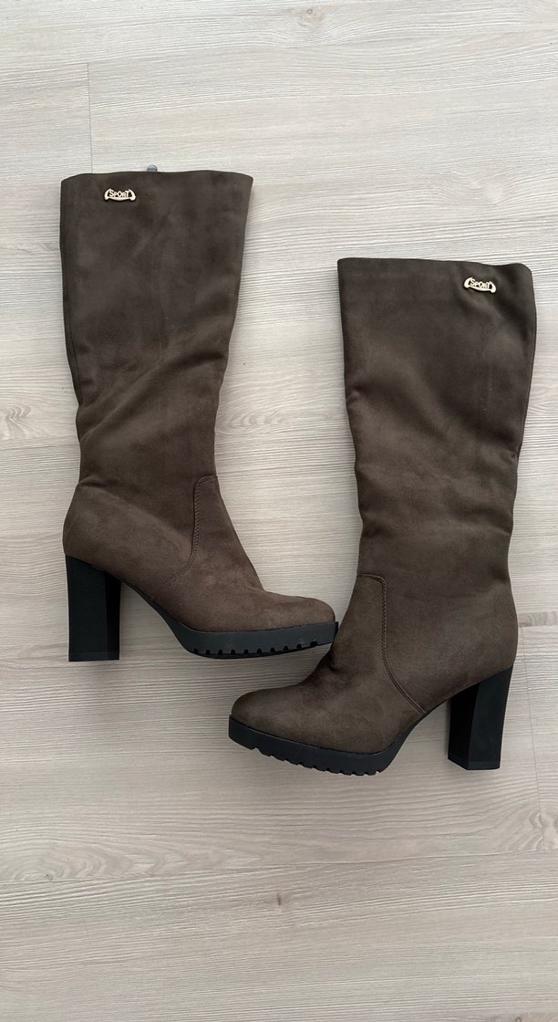 Koyu haki yeşili süet diz boyu botlar, tokalı detayı ve blok topuklu yapısıyla rahat ve çağdaş bir stil sunar. desensiz ve günlük kullanıma uygundur.