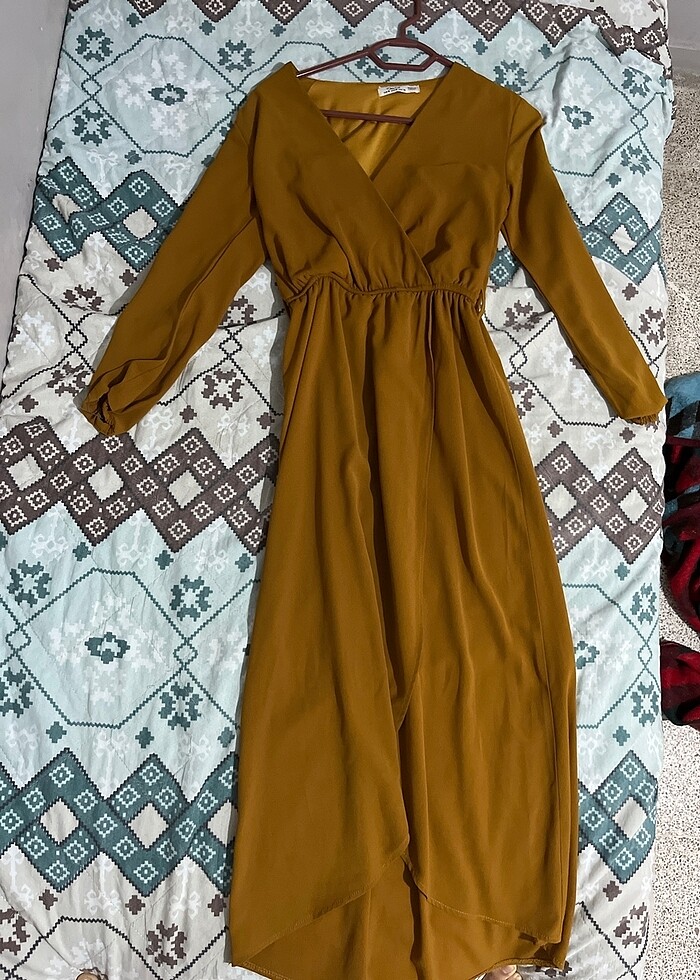 koyu hardal sarisi elbise yirtmacli