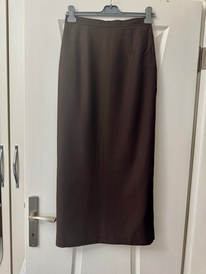 koyu kahverengi uzun etek, regular fit ve ipeksi dokuda. Kumaşı yünlüdür. İPEK astarlıdır Minimalist, sade tarzıyla ofis için uygundur.. uzunluk 100 cm. Bel: 37 cm.GİYİLMEMİŞTİR.
