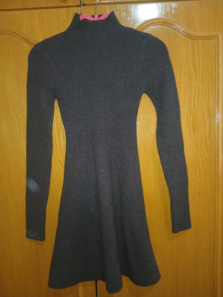 mini örme elbise.Yüksek yakalı, uzun kollu ve vücuda oturan midi elbise, yumuşak yün kumaştan örülmüş ve gri renktedir. Örgü dokusu rahatlık katar, gotik tarzı yansıtır.