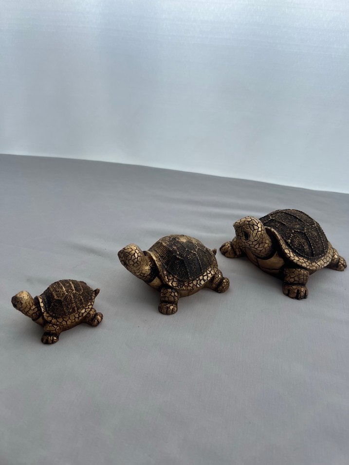 Farklı boylarda, detaylı kabuklu koyu kahverengi kaplumbağa figürlerinden oluşan set.