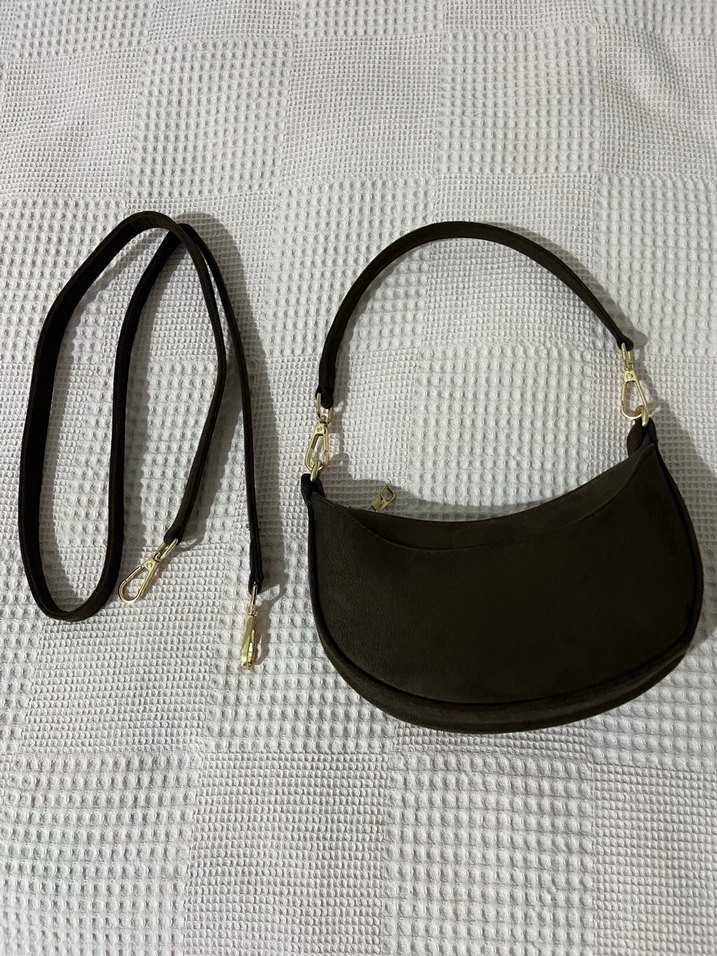 Hiç kullanmadım aynı kumaş aynı renk çantam olduğu için satışta minimal Koyu kahve süet kadın çantası, bel detaylı ve çıkarılabilir askılıdır. Günlük sokak stiline uygun sade ve desen içermeyen Paris esintili tasarım.
