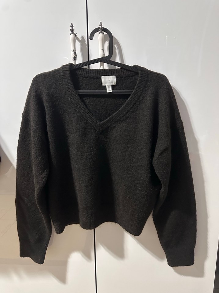 Koyu Kahve örgü yünden yapılmış, V yakalı ve uzun kollu, rahat ve midi boyda kadın kazak.