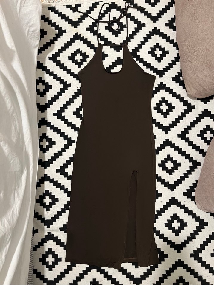 Yüksek yakalı ve ince askılı kahve uzun elbise, düzgün sentetik kumaştan üretilmiştir. Yırtmaç detayıyla sade ve şık bir görünüm sunar, günlük kullanıma uygundur.