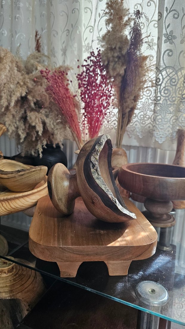 Koyu kahverengi ahşap ayaklı sunumluk, doğal dokusu ve pürüzsüz kıvrımları ile dikkat çeker. Sağlam bir taban üzerinde durur. ceviz ağacından tek parça olarak işlenmiştir ölçü resimlerde mevcuttur
