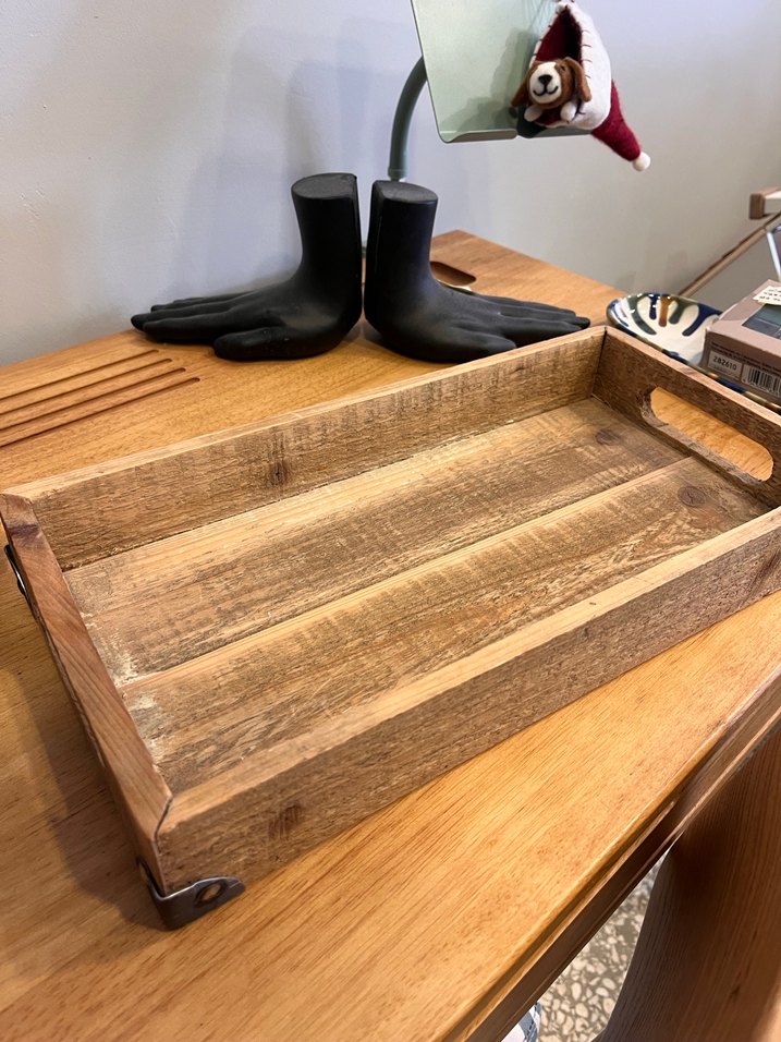 Köşelerinde metal koruyucular bulunan, rustik tasarımlı koyu kahverengi ahşap çatal kaşık kutusu veya tepsi