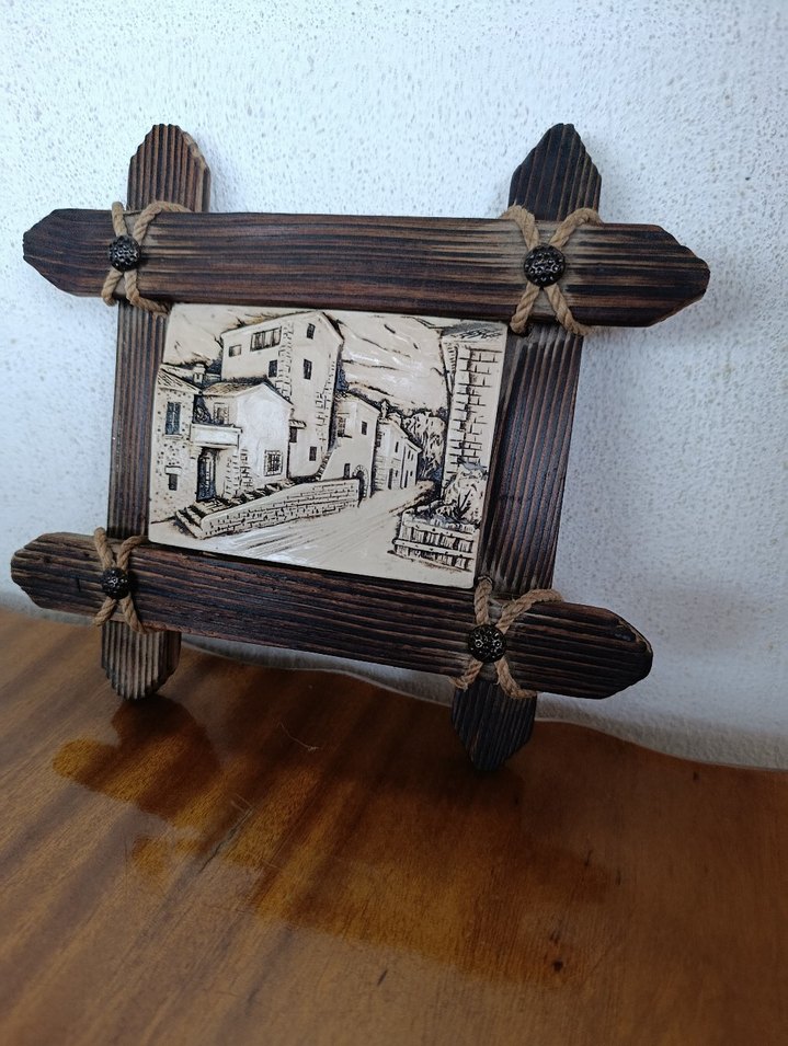 Rustik tasarımlı koyu kahverengi ahşap çerçeve, ortasında siyah beyaz köy çizimi bulunur. Köşeleri ip düğümü detaylıdır. ️