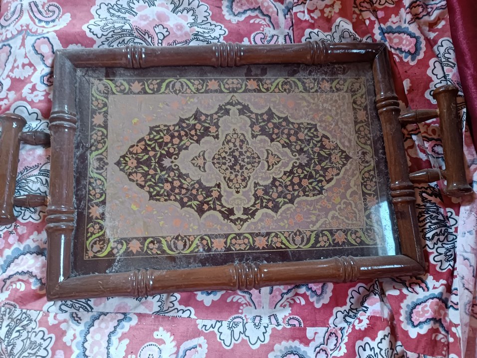 Oymalı detaylara sahip koyu kahverengi ahşap çerçeve, geleneksel desenlerle uyum sağlar. ️ tepsi
