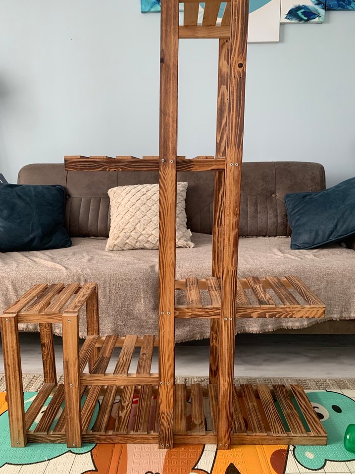 Koyu kahverengi ahşaptan yapılmış, çok katmanlı ve sağlam yapıya sahip raf ünitesi, evde düzen ve sergi için uygundur. İade yoktur her şeyi sorun