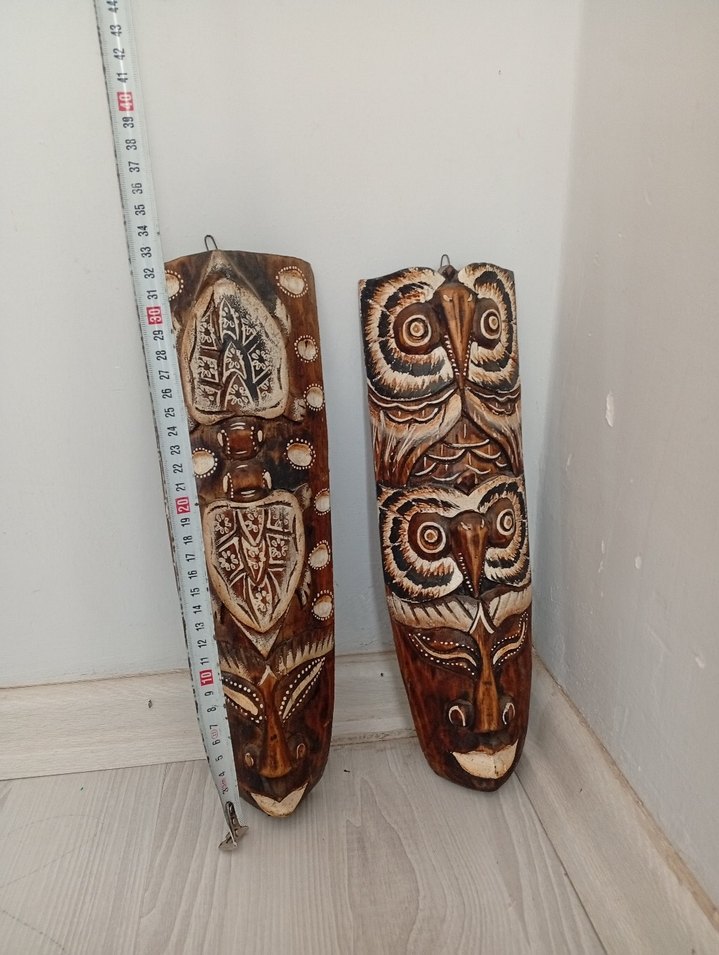 Yaklaşık 35 cm boyunda, baykuş ve kabile desenleriyle oyulmuş koyu kahverengi ahşap figürinler. tekli fiyattır.