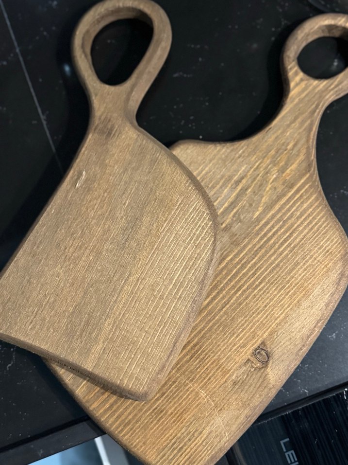 Koyu kahverengi, kulplu ahşap kesme tahtaları. Pürüzsüz yüzey ve doğal ahşap dokusu ile mutfakta kullanım için uygundur.