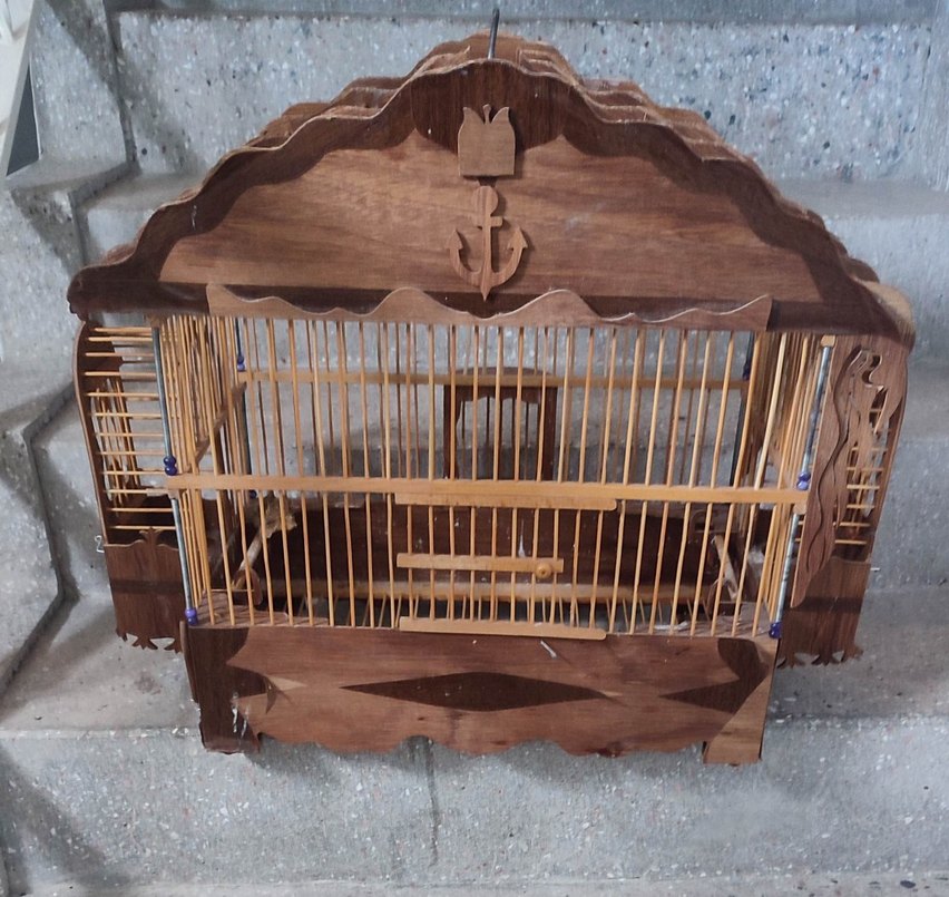 Koyu kahverengi ahşaptan yapılmış, dekoratif üst kısmı ve sağlam çubuklarıyla kuşlar için güvenli ve şık bir kafes. sadece alt kısmı yok karton koyulabilir