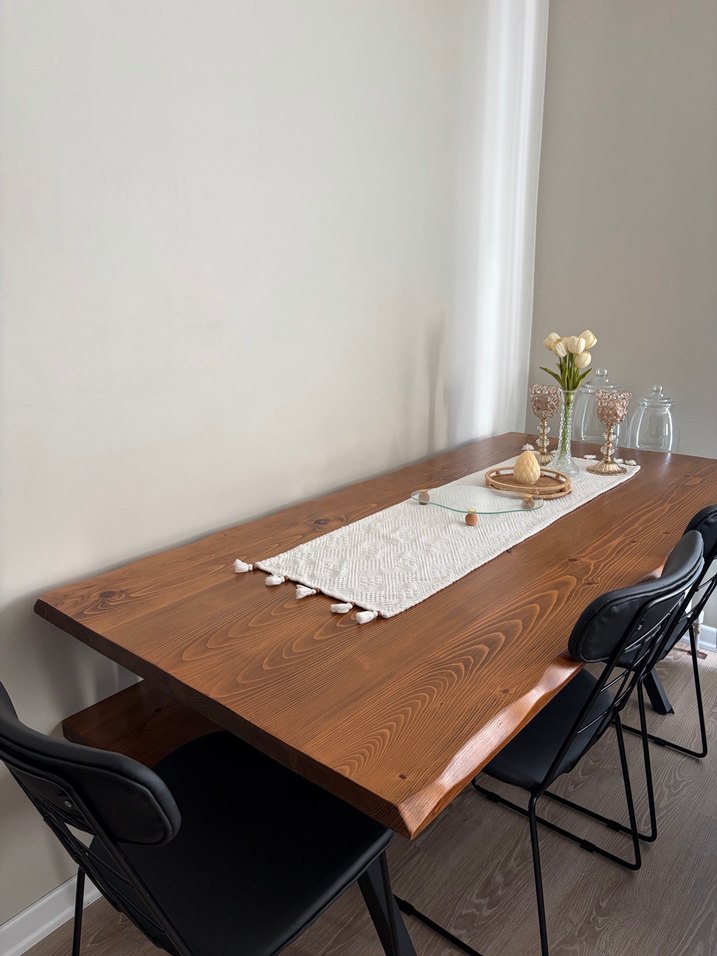 Doğal görünümlü, koyu kahverengi ahşap masa, siyah sandalyelerle birlikte.