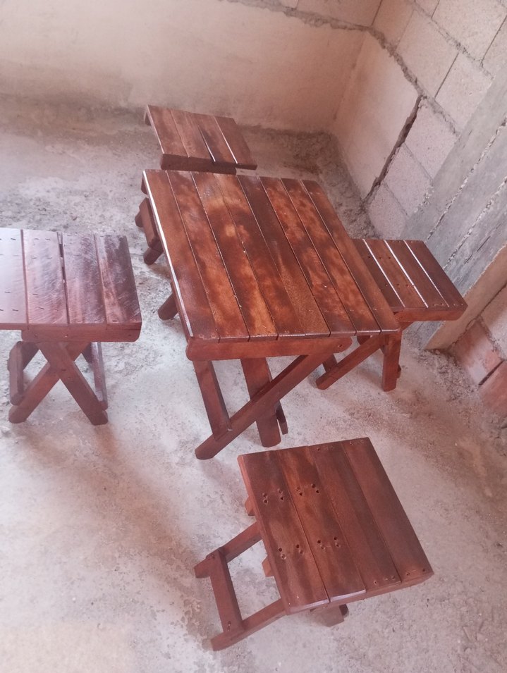 Koyu kahverengi ahşap masa ve dört tabureden oluşan mobilya seti. kendi el emeğimle yapiyorum hem masa hem sandalyesi açılır kapanır vaziyettedir her türlü boyda yapabilirim . seyahatlerde arabanın arkasında rahatça taşınabilir. modele modele fiyat farkı vardır bilgi almak için mesaj atabilirsiniz.