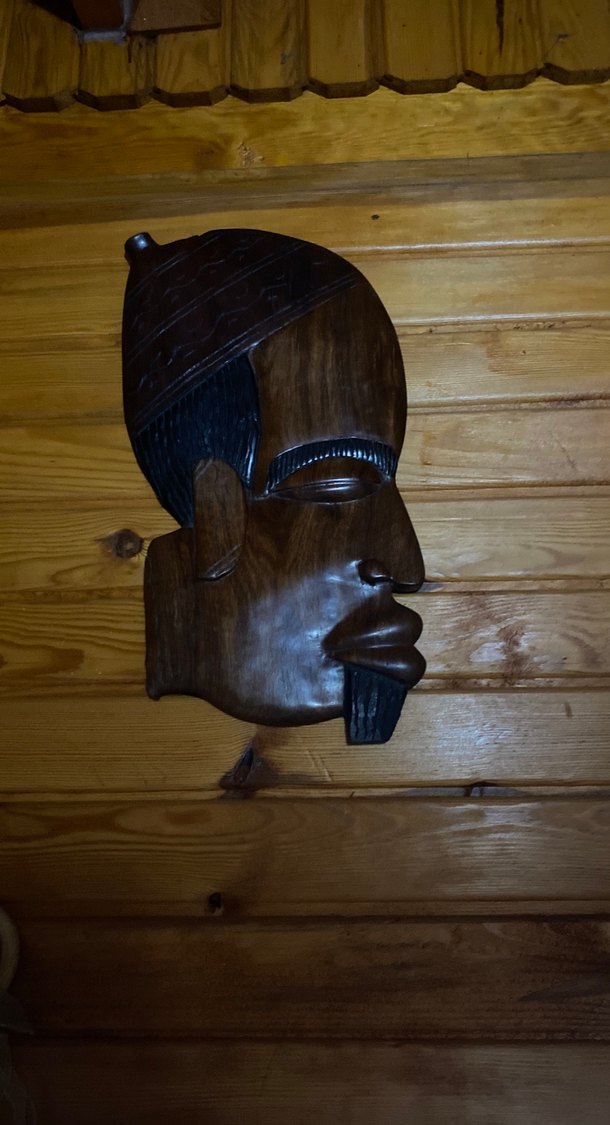 Koyu kahverengi ahşaptan yapılmış, belirgin yüz hatlarına sahip stilize bir insan yüzü figürü. Duvara asılabilir.