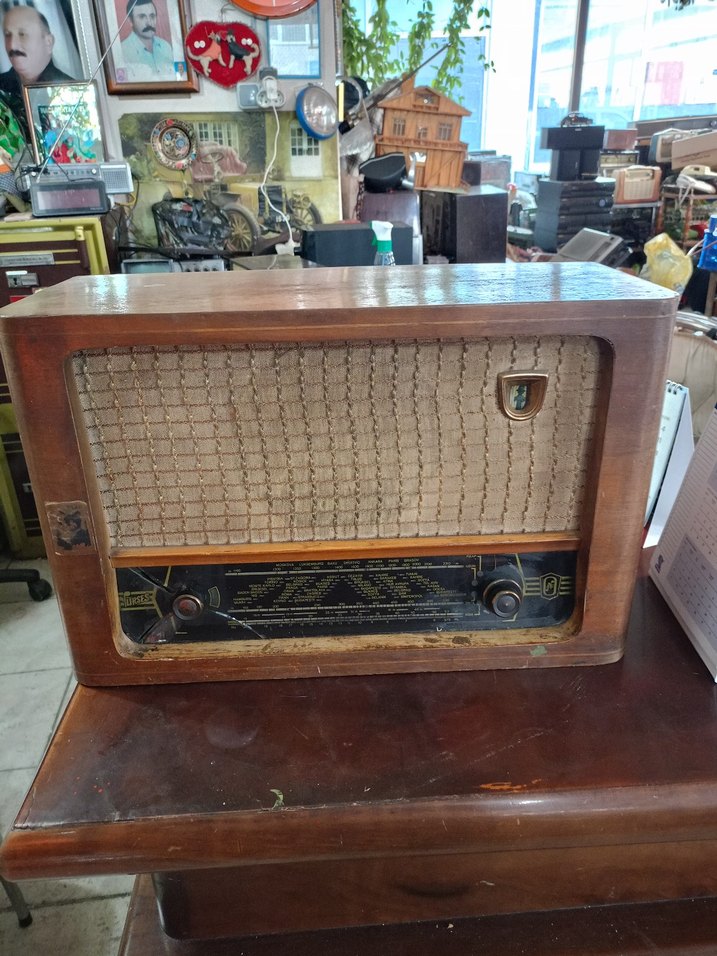 Koyu kahverengi ahşap kasa, örgü ön panel ve klasik ayar düğmelerine sahip vintage müzik seti.