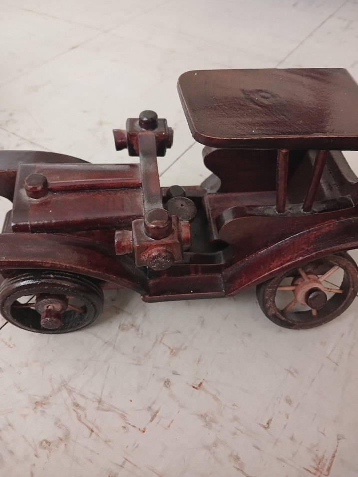Koyu kahverengi ahşap oyuncak araba, detaylı işçiliğe sahip nostaljik tasarımıyla koleksiyon veya dekorasyon için uygundur. plastik değil tarihi mobilyadan yapılmış araba