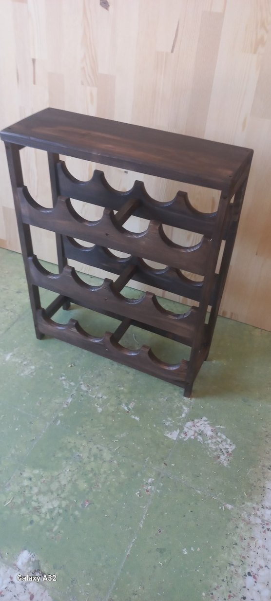 Koyu kahverengi ahşaptan yapılmış, şişeleri güvenle tutan çok katlı şarap rafı. Şarap koleksiyonunuzu düzenlemek için uygundur.