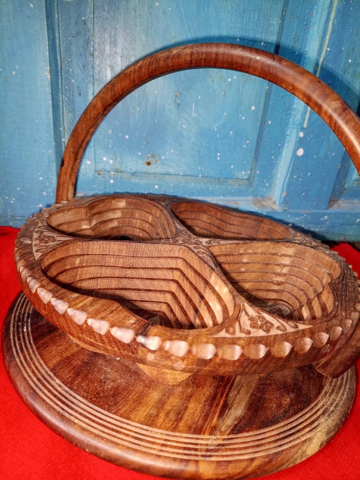 Koyu kahverengi ahşaptan yapılmış, bölmeli ve oyma desenli, yuvarlak saplı sepet. tam bir el işçiliği ve antikadır