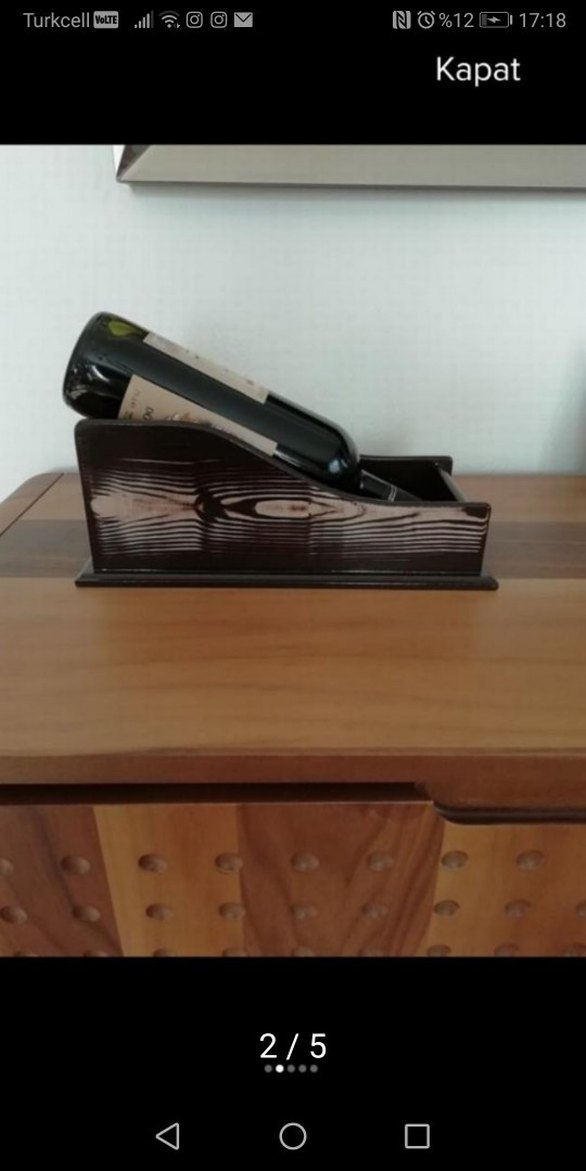 Koyu kahverengi ahşaptan yapılmış, şişe kullanılan kompakt ve şık tutucu.