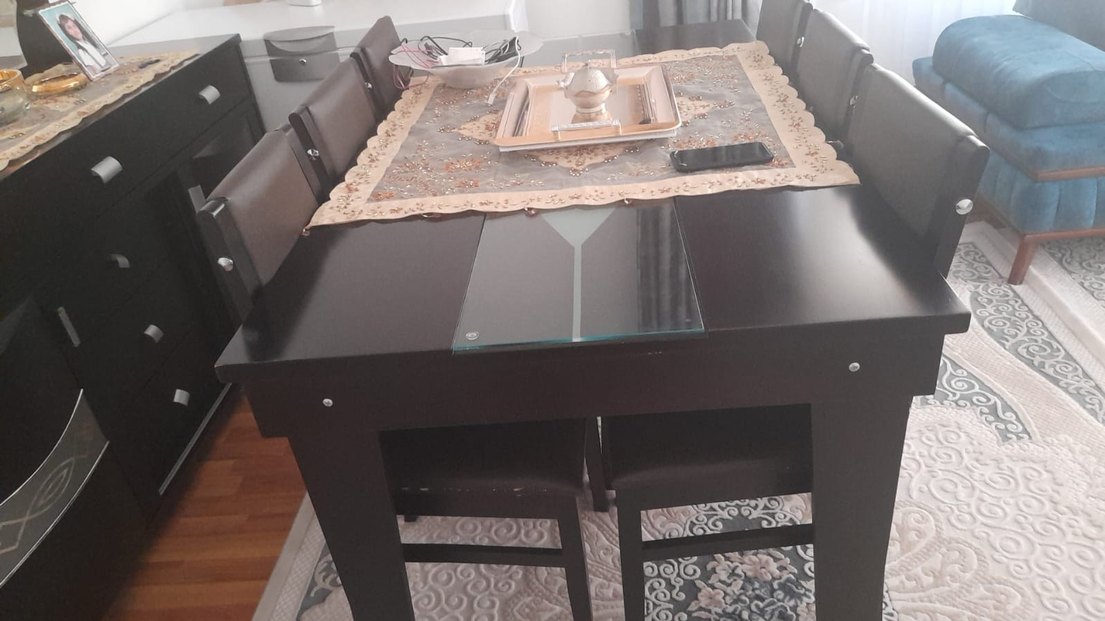 Cam detaylı koyu kahverengi ahşap yemek masası, 6 sandalye hiç kullanılmadı sıfır formunda dekoratif örtü ile şık bir görünüm sunar. ️