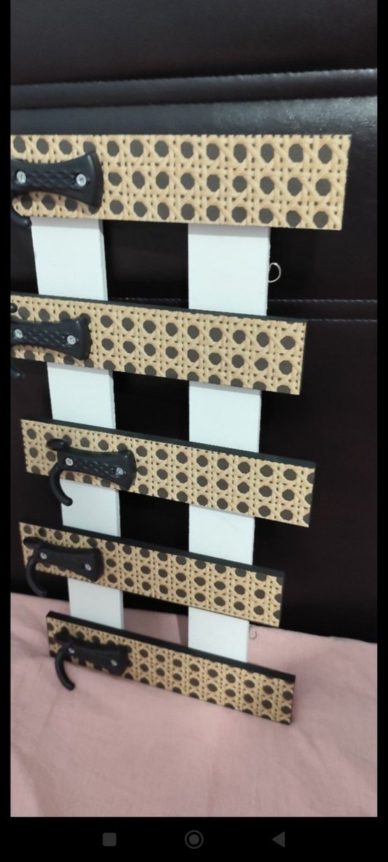 Koyu kahverengi dolap düzenleyici, verimli depolama için çoklu kancalar ve desenli yatay çubuklara sahiptir. sadece bir dişi kırık belli zaten resimde