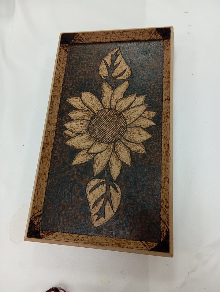 Koyu kahverengi ahşap çerçevede ortada kabartmalı ayçiçeği ve yaprak desenleri bulunur. Doğal ve rustik bir görünüme sahiptir.