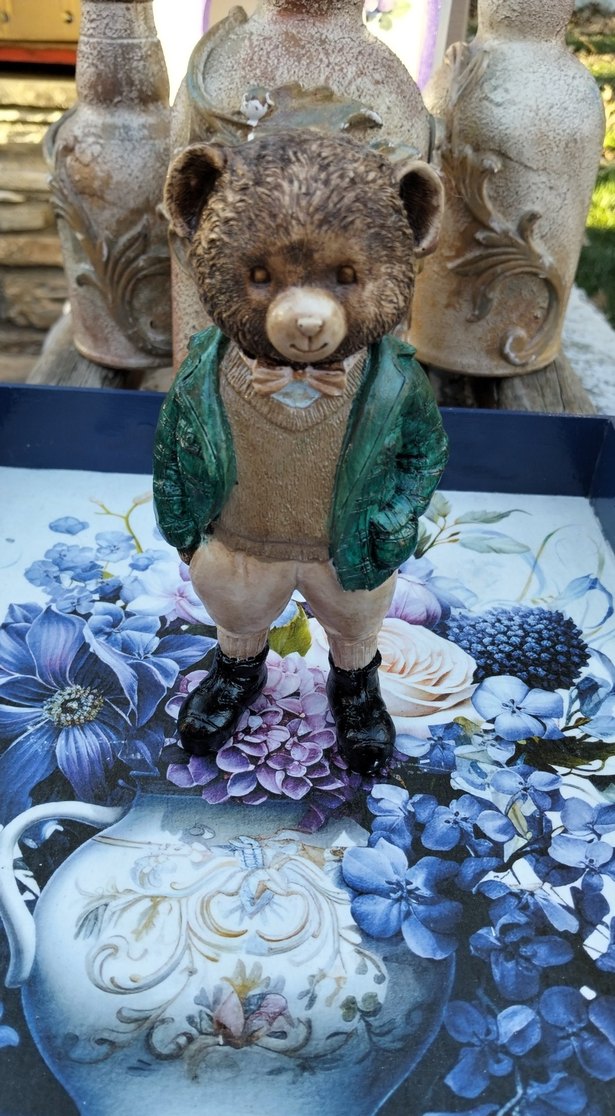 Koyu kahverengi ayı figürü yeşil ceket, bej pantolon ve siyah botlar giyiyor, çiçek desenli bir yüzeyde duruyor.