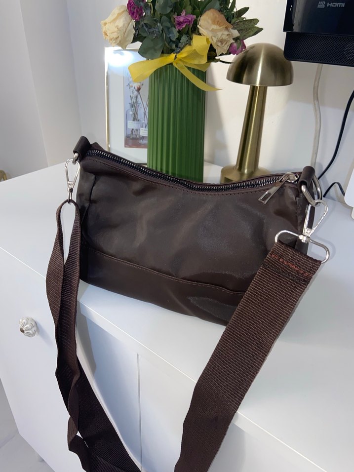 Kahverengi uzun askılı baget çanta. İçi fazlaca eşya alıyor.