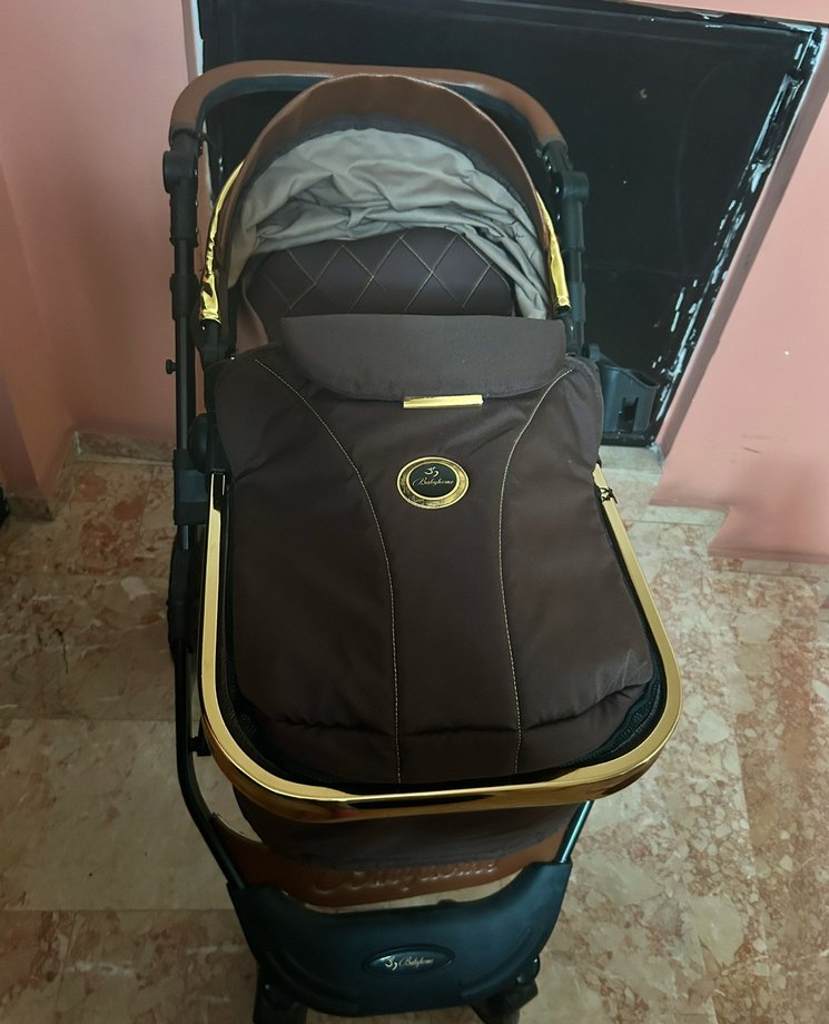 Koyu kahverengi bebek arabası, yastıklı oturma alanı ve tente, altın detaylar ve sağlam çerçeveye sahiptir ve sadece puset başlığı kullanıldı o da topu topu taş çatlasın en fazla 10 sefer falandır o derece yeni sadece pusetin bir aparatında kırık var o da kullanıma engel değildir
