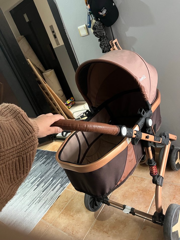 Koyu kahverengi renkte, rahat tutma sapı ve sağlam gövdesiyle kolay hareket ettirilebilen bebek arabası. Görselde her şey olduğu gibi son fiyat