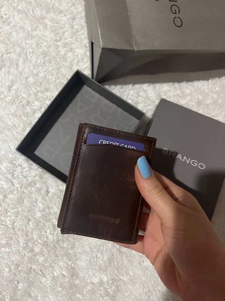 Brango marka koyu kahverengi erkek cüzdanı, baskılı desene ve kart yuvalarına sahip kompakt bir tasarıma sahiptir. Klasik iş tarzını hafif karşı kültür dokunuşuyla birleştirir. Orjinal deri sıfır kutulu