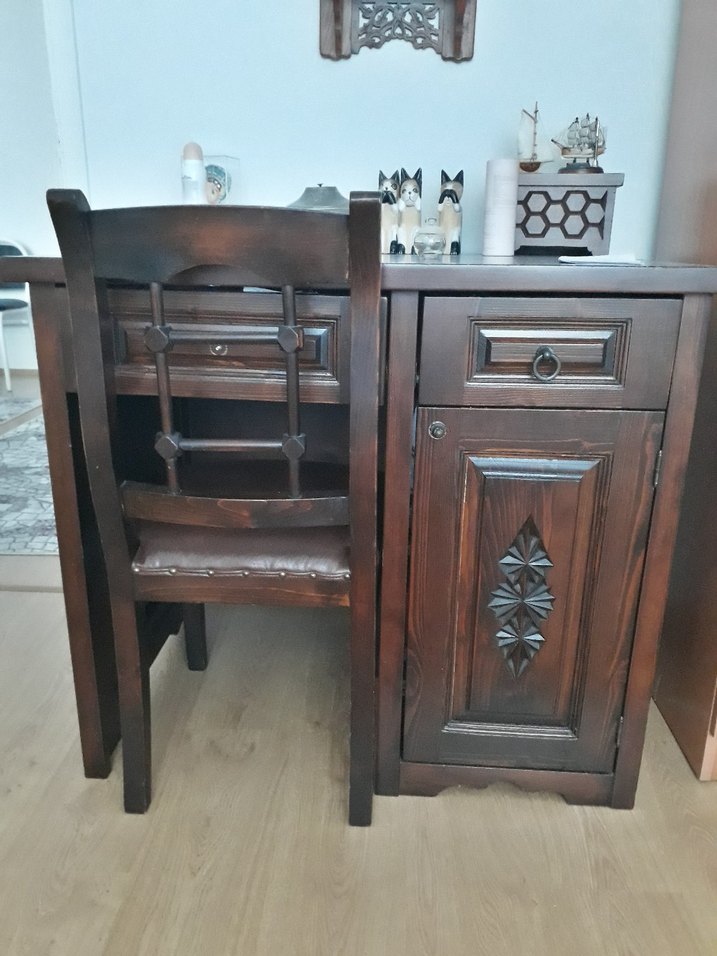 Dekoratif panelli koyu kahverengi çalışma/bilgisayar masası ve uyumlu sandalye. Ofis yada evde kullanılabilir eskitme şık bir takımdır. Çekmeceleri ve raflı dolabı ile depolama sağlar. İstanbul-Avrupa yakasındadır.Herhangi bir defosu, çiziği yoktur, çekmece kulbu eksiktir.Fazlalıktan satıyorum.