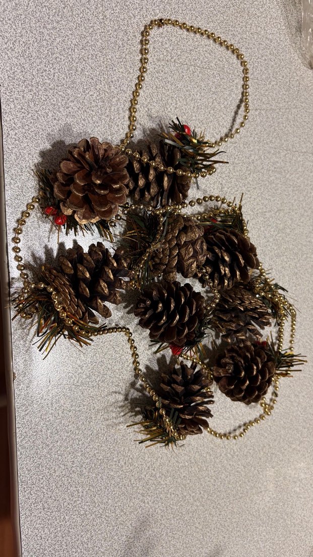 Koyu kahverengi çam kozalakları ve altın renkli boncuk zincirden oluşan ev dekorasyonu için süs zinciri.