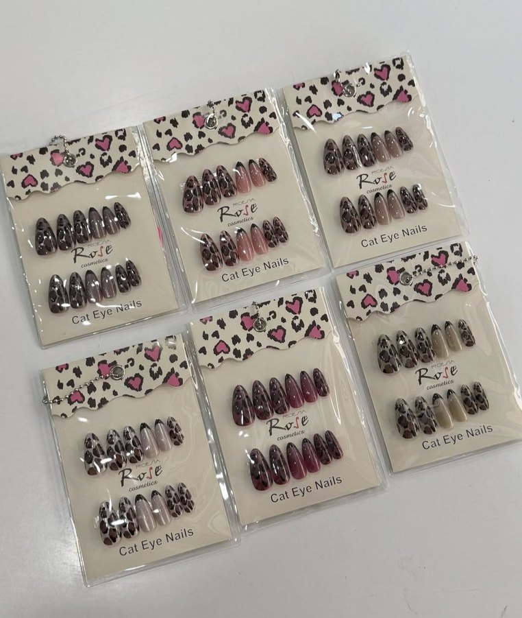 Koyu kahverengi, gül ve leopar desenli Cat Eye tırnak süsleri. Her pakette parlak yüzeyli çoklu tırnak bulunur.