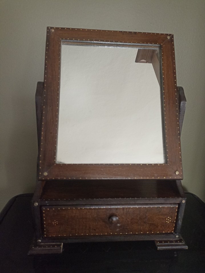 Dikdörtgen şeklinde, dekoratif çivilerle süslenmiş koyu kahverengi çerçeveli masa aynası, alt kısmında küçük bir çekmece içerir.