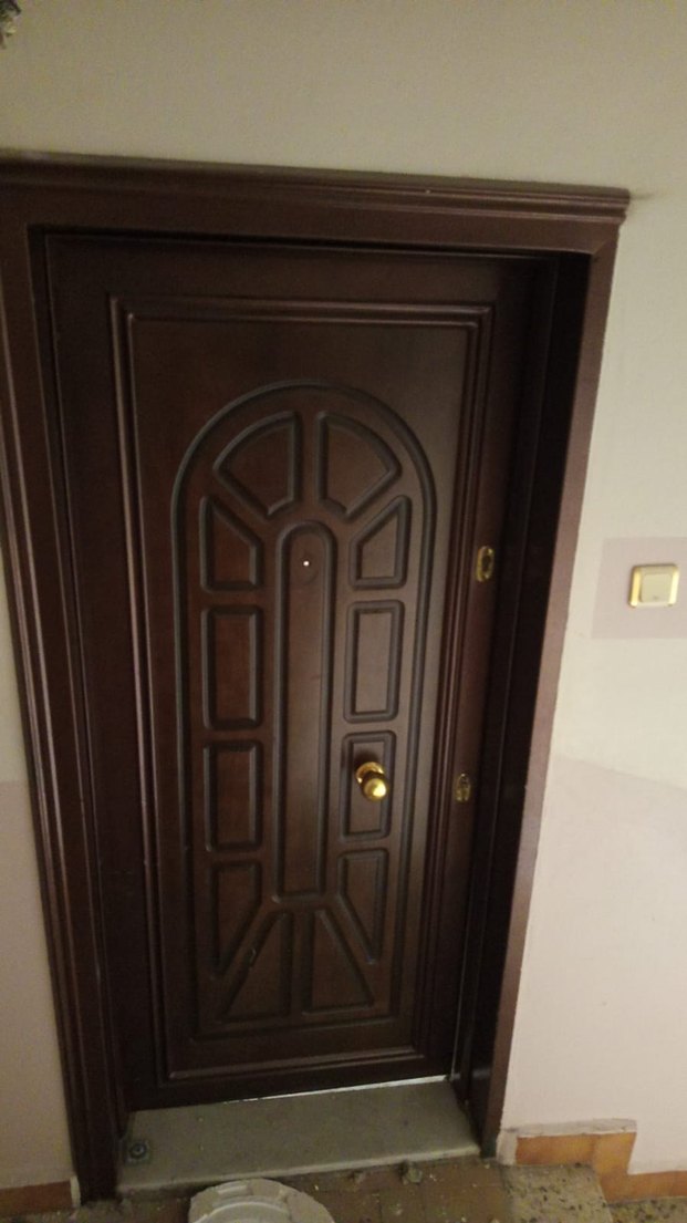 Geometrik panel tasarımlı, koyu kahverengi dekoratif kapı. Pirinç kapı kolu, gizli bakış deliği ve güvenli kilit sistemi bulunur.