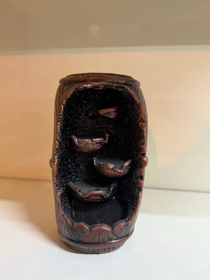 Koyu kahverengi tütsülük iç kısmında küçük kaseden oluşan dokulu raflara sahip olup dekoratif bir görünüm sunar.