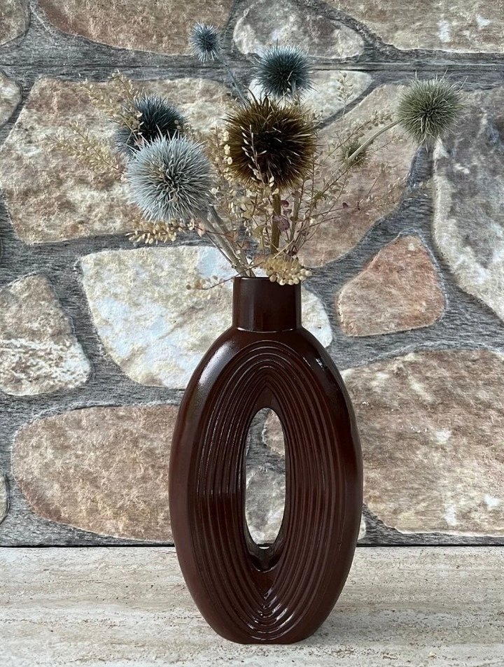 Koyu kahverengi, oval şekilli ve ortası boş olan dokulu yüzeye sahip vazo, kuru çiçekler için uygundur. Boyutu 25 cmdir el emeğidir #vazo #hediyelik #ceyiz #çeyiz #vazo #kahverengi #obje #dekor