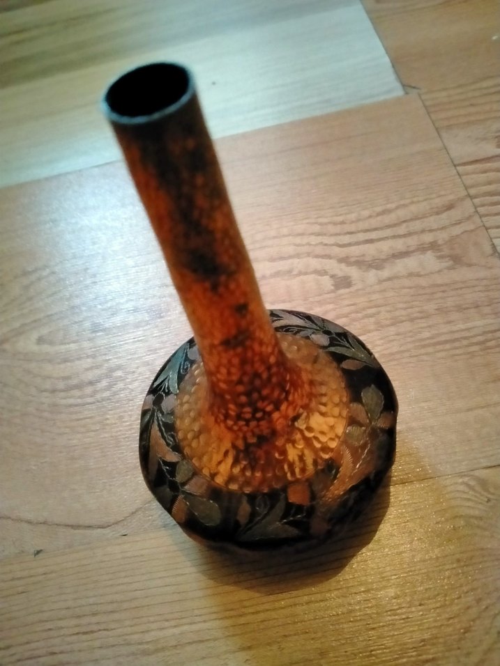 Dar boyunlu, dokulu yüzeyli koyu kahverengi bir vazo. Küçük çiçekler için veya dekor amaçlı kullanılabilir. Bazı yerlerinde ezilmeler var