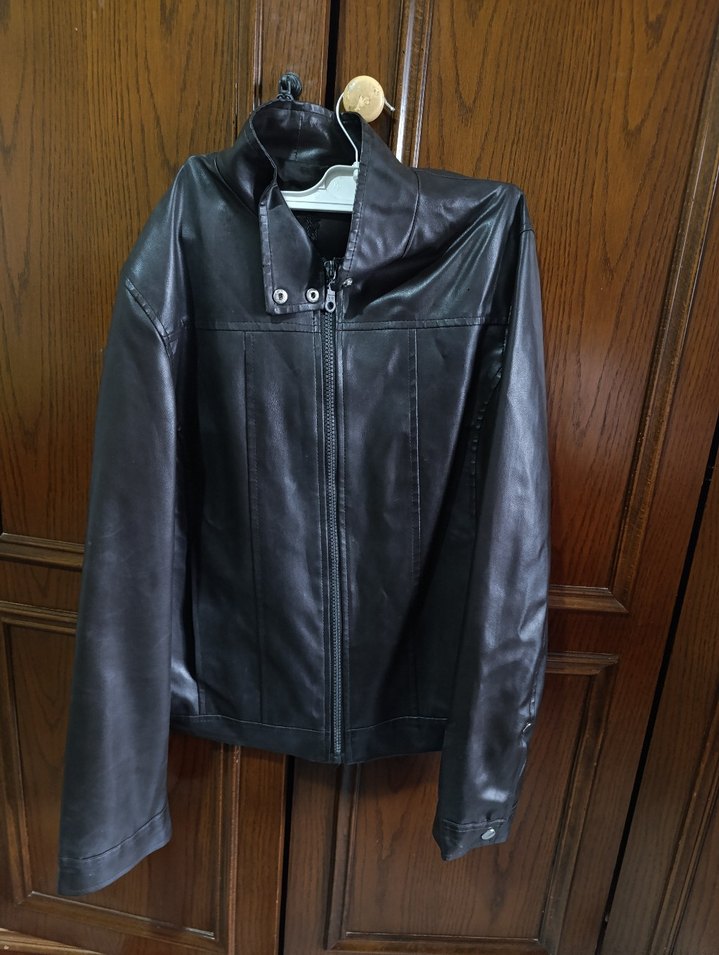kahverengi deri biker ceket, dar kesim ve çıtçıtlı yakaya sahip. Fermuarlı. defosu fotoğrafda görünüyor başka sorun yok s ve m uyumlu