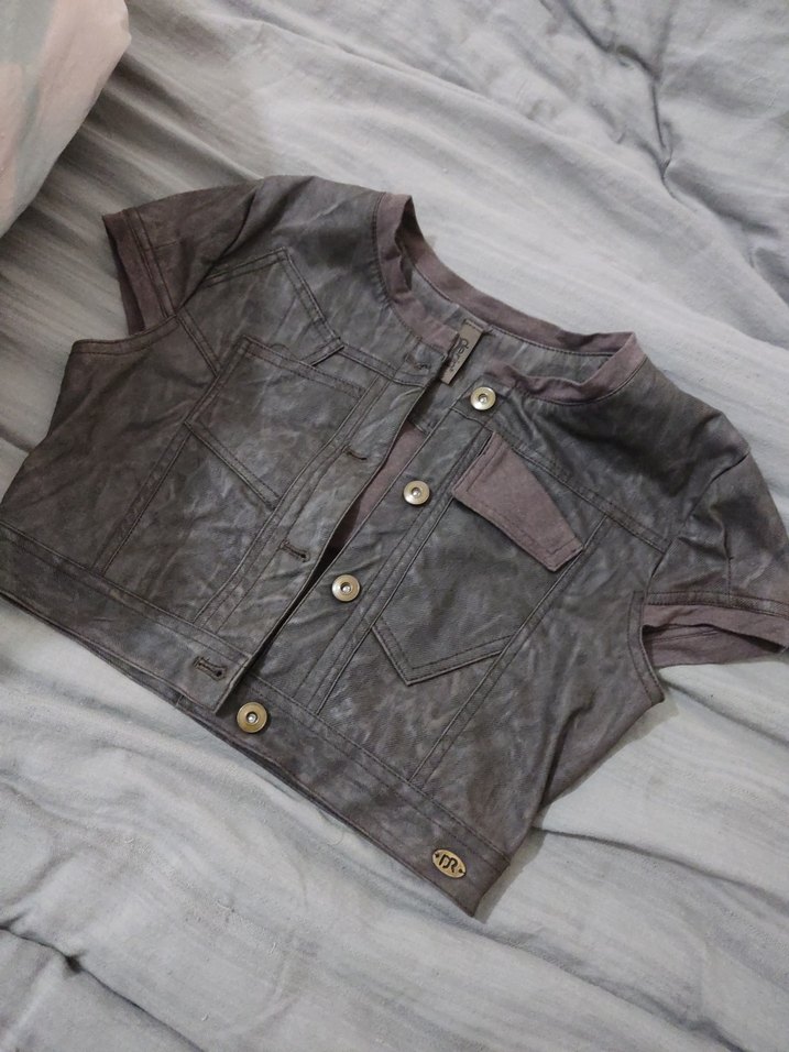 Deri kumaştan, kısa kollu ve yuvarlak yakalı, düğmeli kapamalı, fitted kesim koyu kahverengi