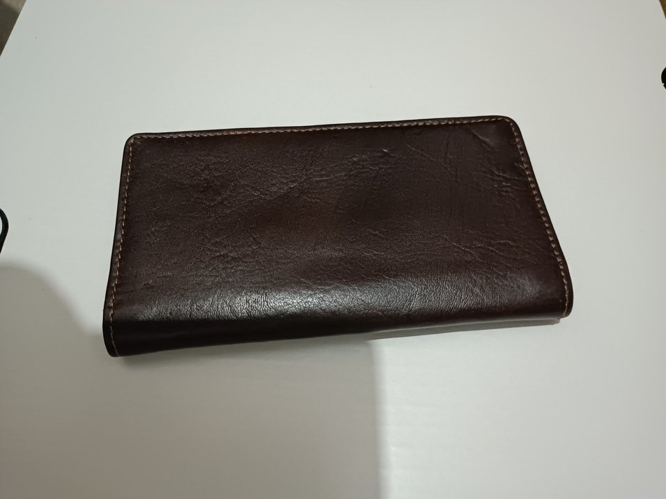 Koyu kahverengi deri, kapanışa ve desensiz düz yüzeye sahiptir. Günlük kullanıma uygun sade ve klasik tasarım.