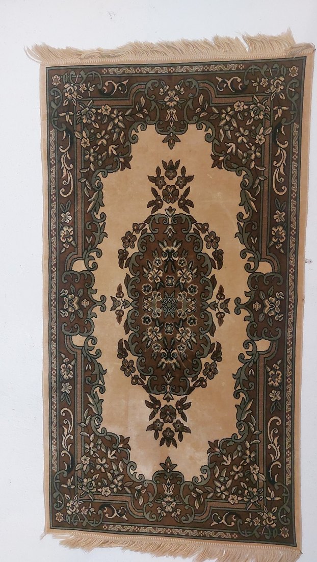 Koyu kahverengi desenli, bej zemin üzerinde çiçek ve süs motifleri bulunan geleneksel halı. Mekanlara klasik bir dokunuş katar. Sağ alt kenar püskülünde sökülme mevcuttur 160x87 cm ölçüleri