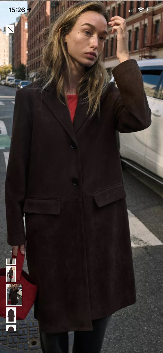 Düğmeli kapama ve kapaklı cepleri olan koyu kahverengi kaban, klasik ve şık bir görünüm sunar. Uzun kollu ve rahat kesimlidir.