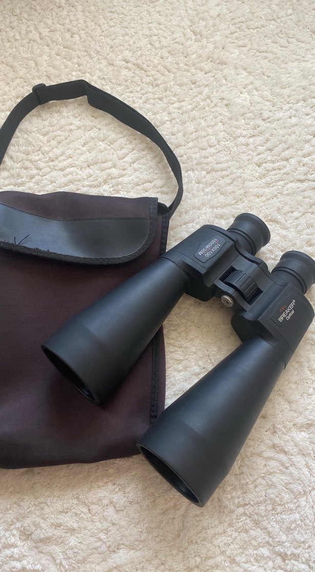Ayarlanabilir odaklı koyu kahverengi dürbün ve taşıma kolaylığı sağlayan uyumlu çanta.