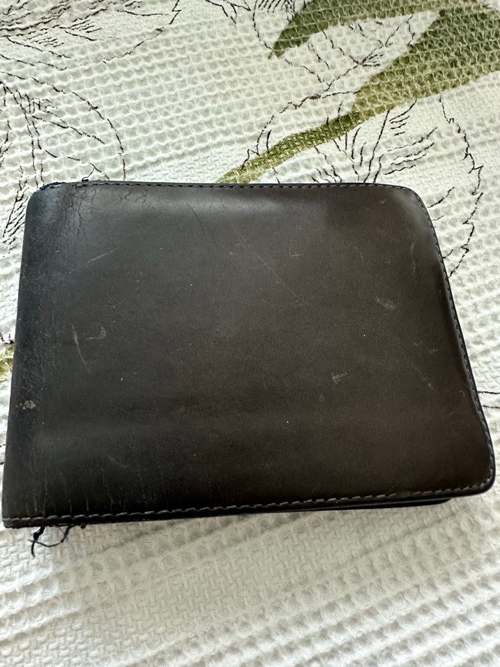 Koyu kahverengi, düz yüzeyli ve kullanılmış görünümlü erkek cüzdanı. Paris tarzı karşı kültür için uygun sade tasarım.